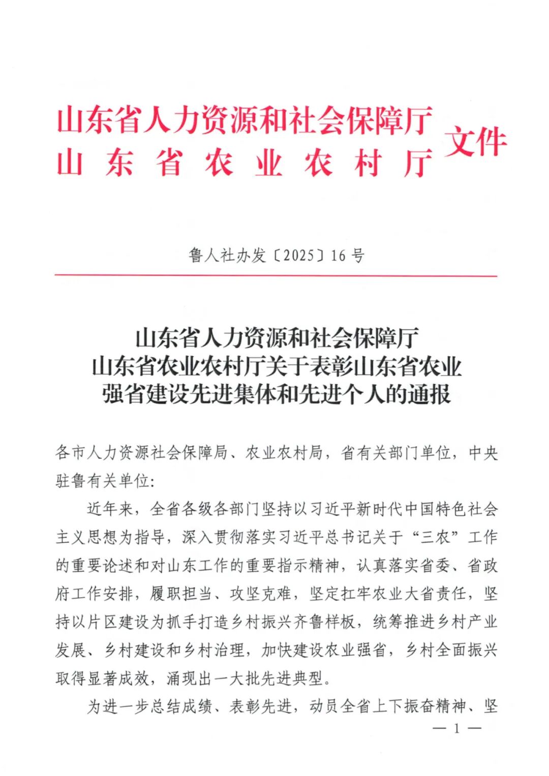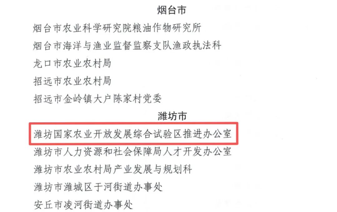 12月31日,省人力资源和社会保障厅、省农业农村厅联合印发《关于表彰山东省农业强省建设先进集体和先进个人的通报》,对加快建设农业强省,推进乡村全面振兴等工作中涌现出的先进典型进行通报表彰,潍坊国家农综区推进办获评“山东省农业强省建设先进集体”。
